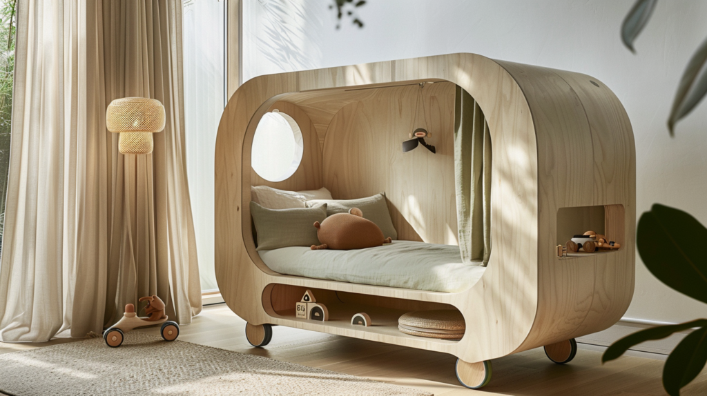 Inspirée du nid , forme organique, protectrice, intime — la capsule est une unité de vie autonome sur roulettes. Elle contient tout ce dont l’enfant a besoin : un espace de sommeil enveloppant, un rangement escamotable, un bureau ou un tableau qui se déploie, et une entrée latérale un petit passage, comme on entrerait dans un nid — qui crée un sentiment d’appartenance et de secret.
